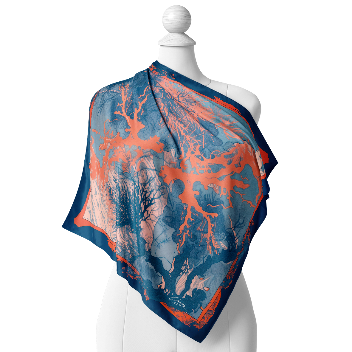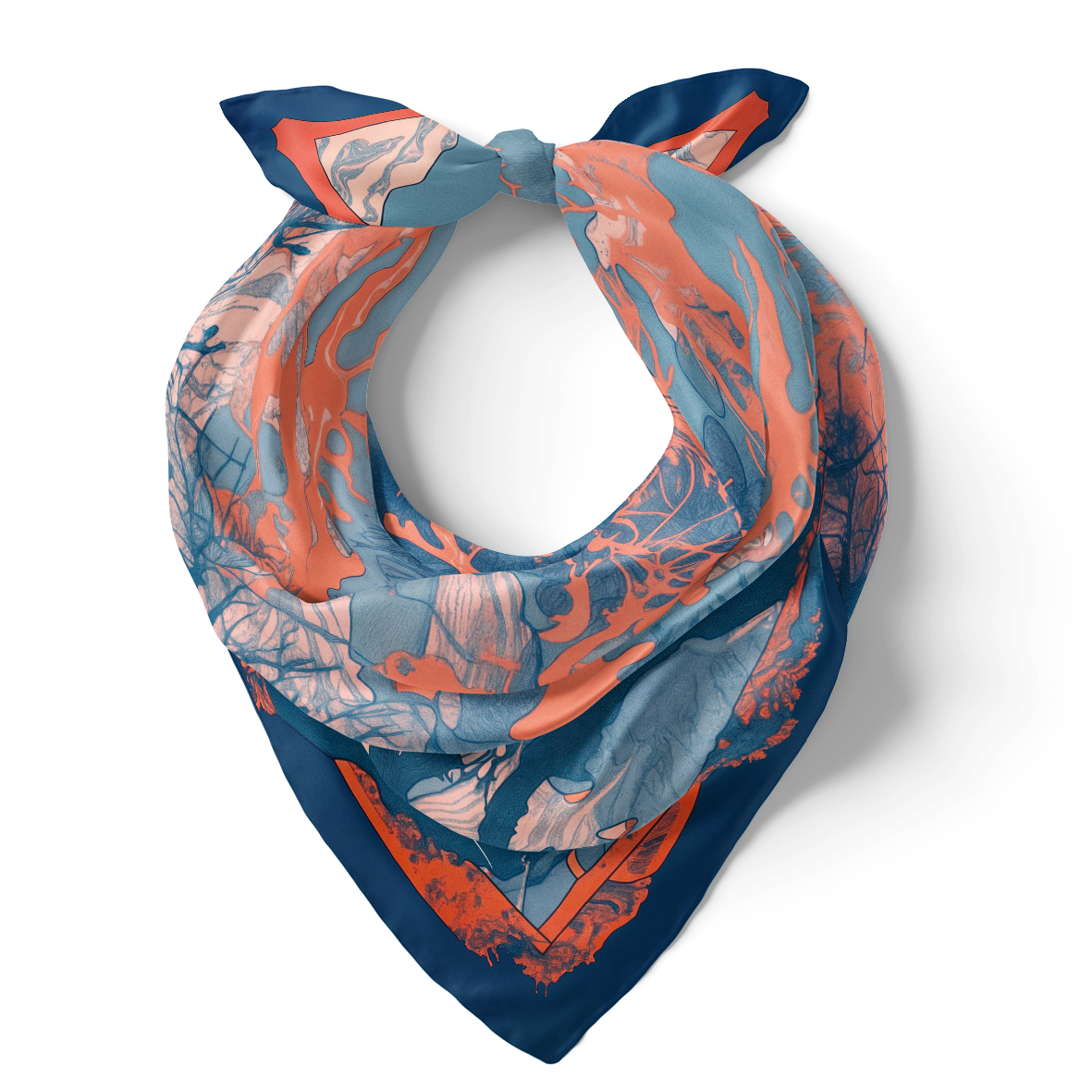 Dubine Okeana Dočaravajući lepotu okeana, ova marama kombinuje nijanse duboko plave i koralne boje, podsećajući na podvodne grebene. Donosi osvežavajući dodir svakoj kombinaciji, idealna za trenutke kada dama traži povezanost sa dubinama prirode i spokojem. Savršena za izražavanje smirenog, ali avanturističkog duha.